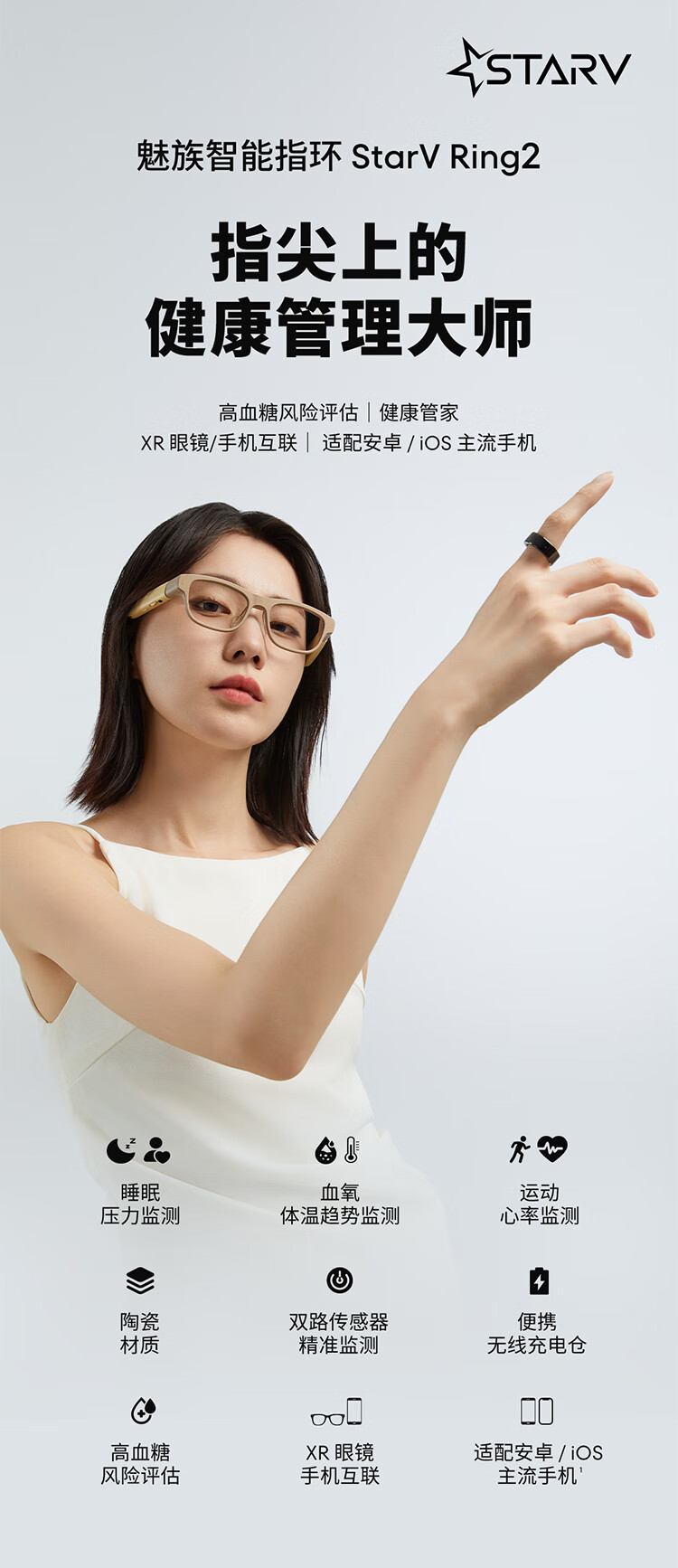 魅族StarV Ring2智能戒指 睡眠心率血氧实时健康监测 长续航超薄防水指环10号 适配苹果华为三星手机